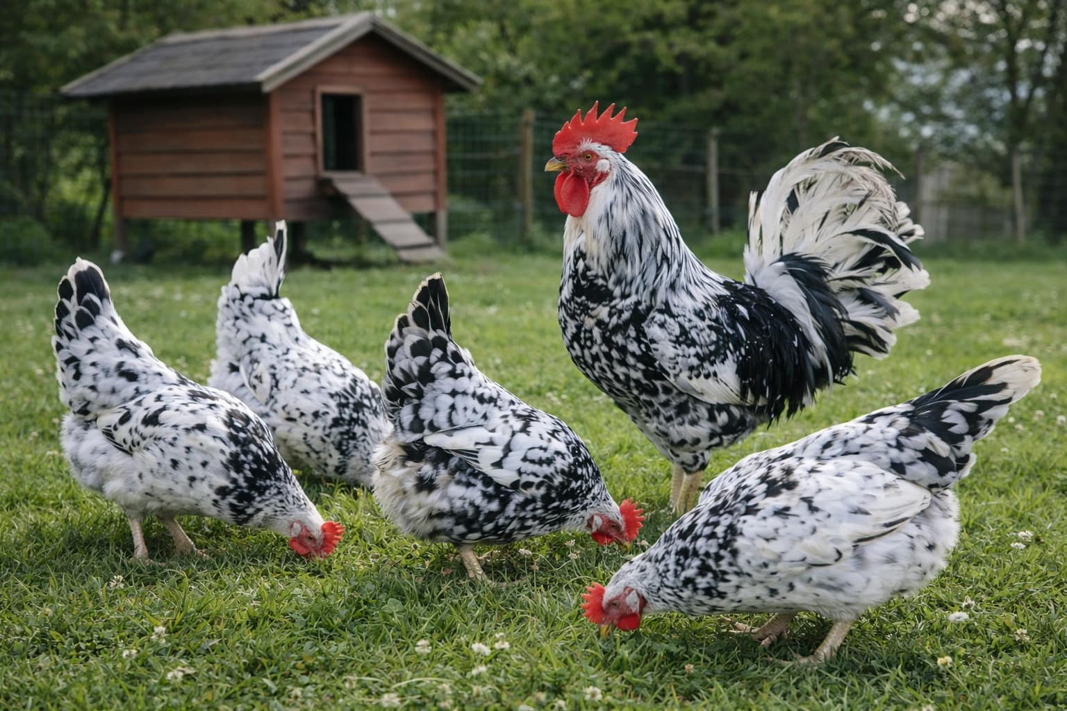 Die Farbvariante Exchequer zeichnet sich durch ihr auffälliges schwarz-weiß geschecktes Gefieder aus und verbindet die Leistungsfähigkeit der Leghorn mit einer besonderen Optik.